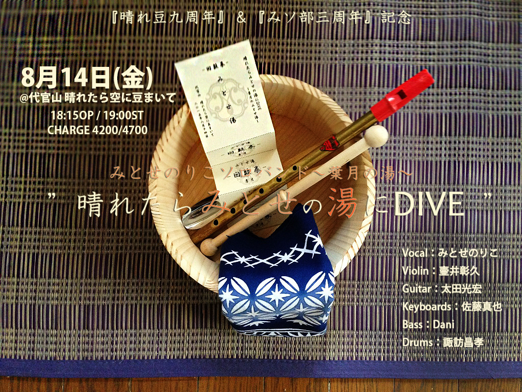 8月は晴れ豆さんの9周年月間とのことですが、実はみソ部も7月で満三歳、三周年を迎えます。4年目のみソ部一発目の公演になりますので、ここは晴れ豆&みソ部合同周年記念として、はぴーばーす俺たち!+みとせ湯ダイヴのホットでめでたい一日にしたいと思います。皆様もどうぞご一緒に、迎えられた1年と新たな1年の円環の繋ぎ目を祝っていただければ幸いです。(ライヴ終盤には円環が半回転をキメてメビウスの輪になっちゃってるかもしれないけどね…!)